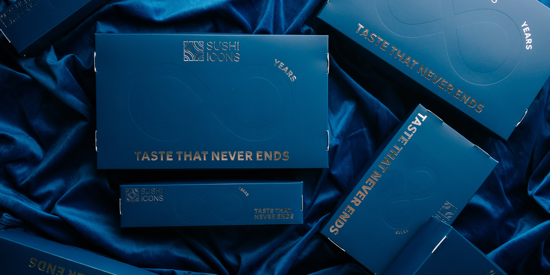 Releasing limited-edition packaging for the company's birthday has become a special tradition for Sushi Icons. It serves as an annual visual manifesto highlighting the brand's achievements. For the anniversary collection, we developed a design in the "Midnight Luxury" style: a deep, rich dark blue color paired with gold foil stamping. The centerpiece features an infinity symbol graphic and the slogan "Taste that never ends," symbolizing consistent quality and customer trust over the years.