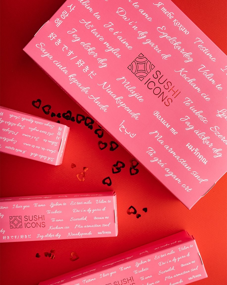 For Valentine's Day, we created a romantic limited edition in a soft pink color. The design concept is "Love knows no borders": the box lid features the phrase "I love you" multiplied in dozens of world languages, from Ukrainian to Japanese, executed with elegant foil stamping.
