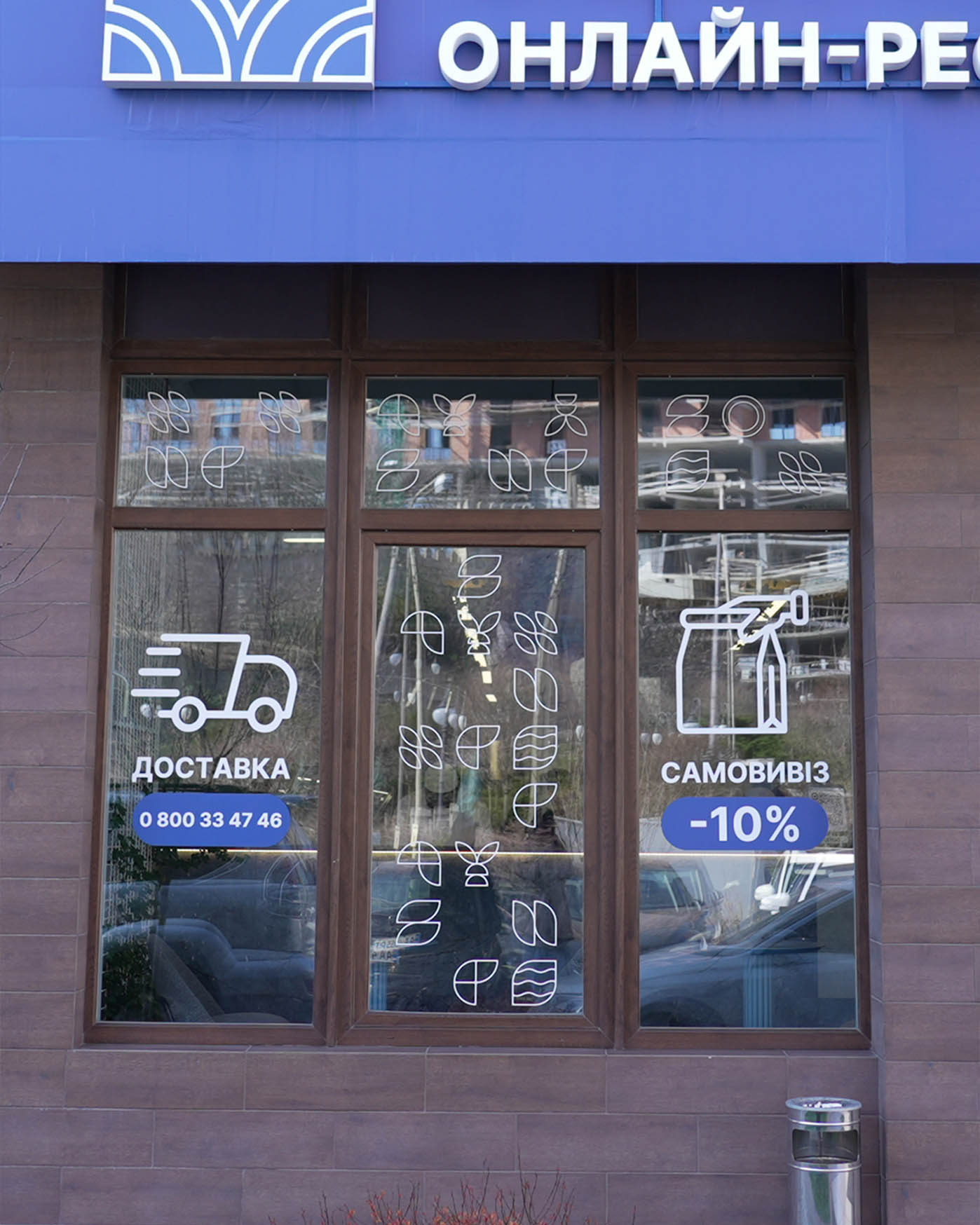Тут ми працювали з більш спокійною, функціональною локацією. Пряма вітрина, іконки доставки й самовивозу, чистий фасад без зайвих деталей. Саме такі точки особливо цікаво трансформувати, бо будь-яка сезонна зміна одразу відчувається сильніше.
