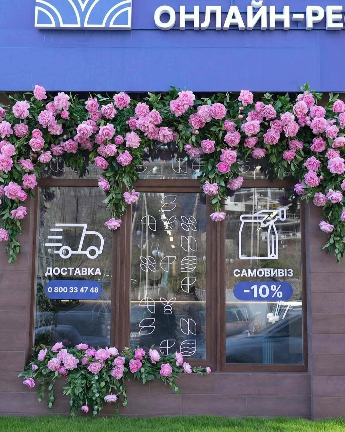 У фінальній версії фасад отримав чіткий квітковий контур, який працює як рамка для вітрин. Рожеві бутони й зелень підкреслюють горизонталь будівлі, додають глибини та створюють відчуття доглянутості й свіжості.