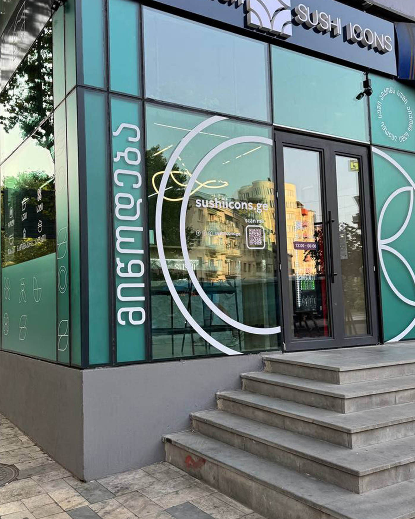 Ця локація з самого початку вимагала іншого підходу. Скляний кутовий фасад, графічні патерни Sushi Icons, сходи, що ведуть до входу, і активний міський потік навколо. Тут ми вирішили піти не шляхом делікатних акцентів, а створити сильний сезонний жест, який перетворює точку на візуальну подію.