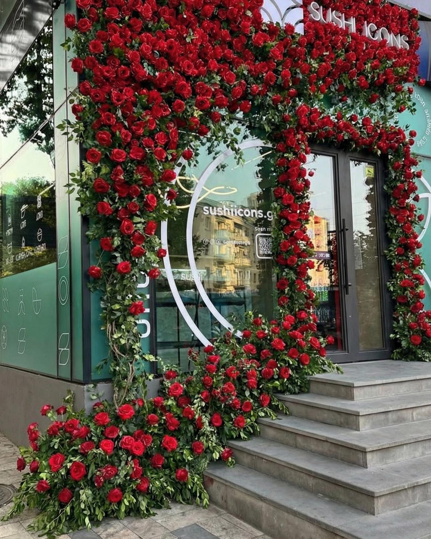 У фінальній версії вхід перетворився на насичений квітковий портал, який буквально обрамляє рух від вулиці до дверей. Червоні троянди створюють глибину, задають ритм і різко контрастують зі спокійною графікою фасаду, роблячи точку помітною з далекої дистанції.
