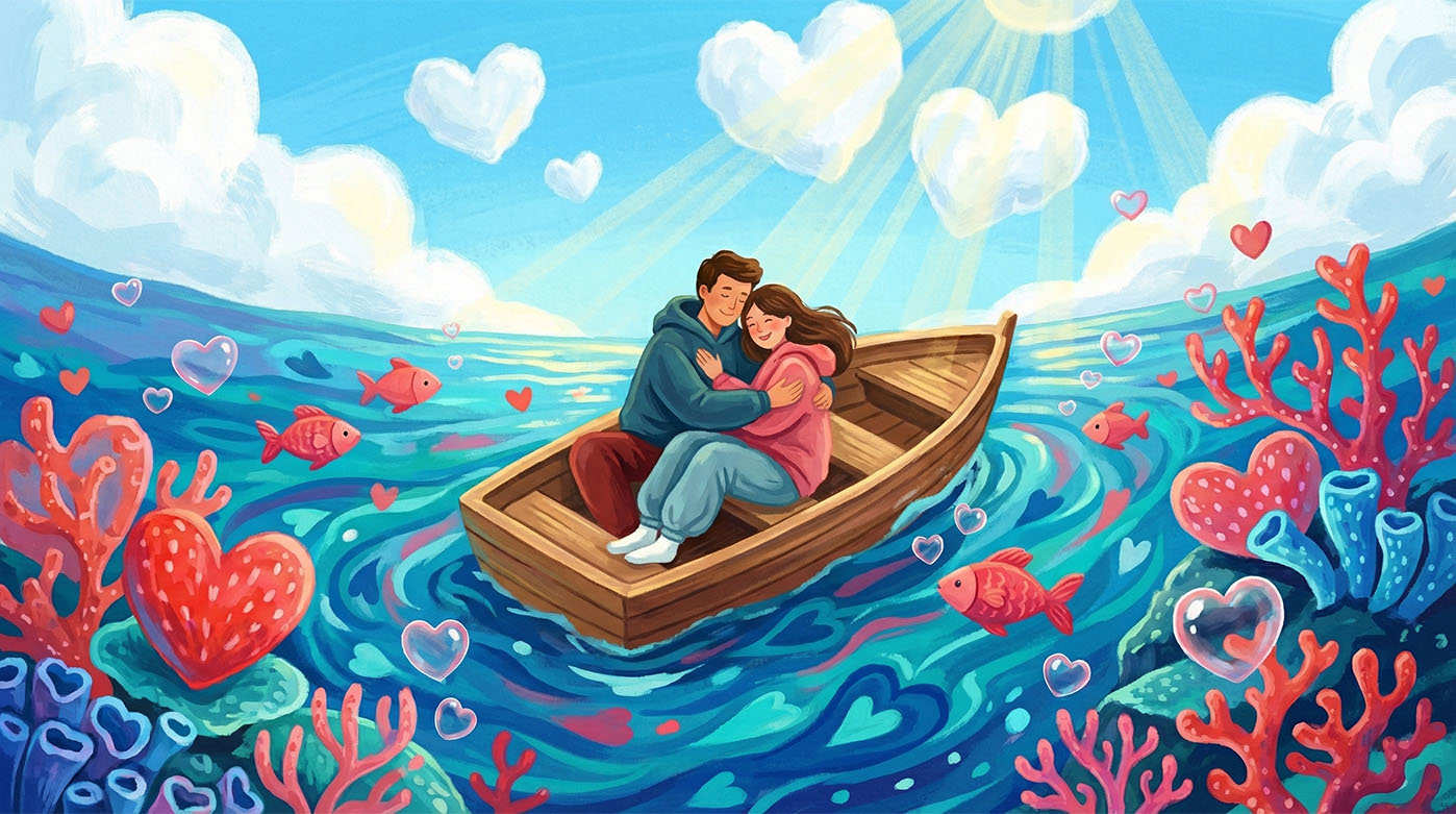 Перша робота цього блоку переносить нас в епіцентр «океану кохання». Ми навмисно зробили акцент на насичених синіх та коралових відтінках, де замість рифів — яскраві серця, а замість звичайної води — потік щирих емоцій. Човен тут виступає символом спільного шляху, де пара захищена від усього світу своєю близькістю. Це візуалізація того відчуття, коли ви «в одному човні» і весь навколишній світ стає яскравим фоном для вашої історії.