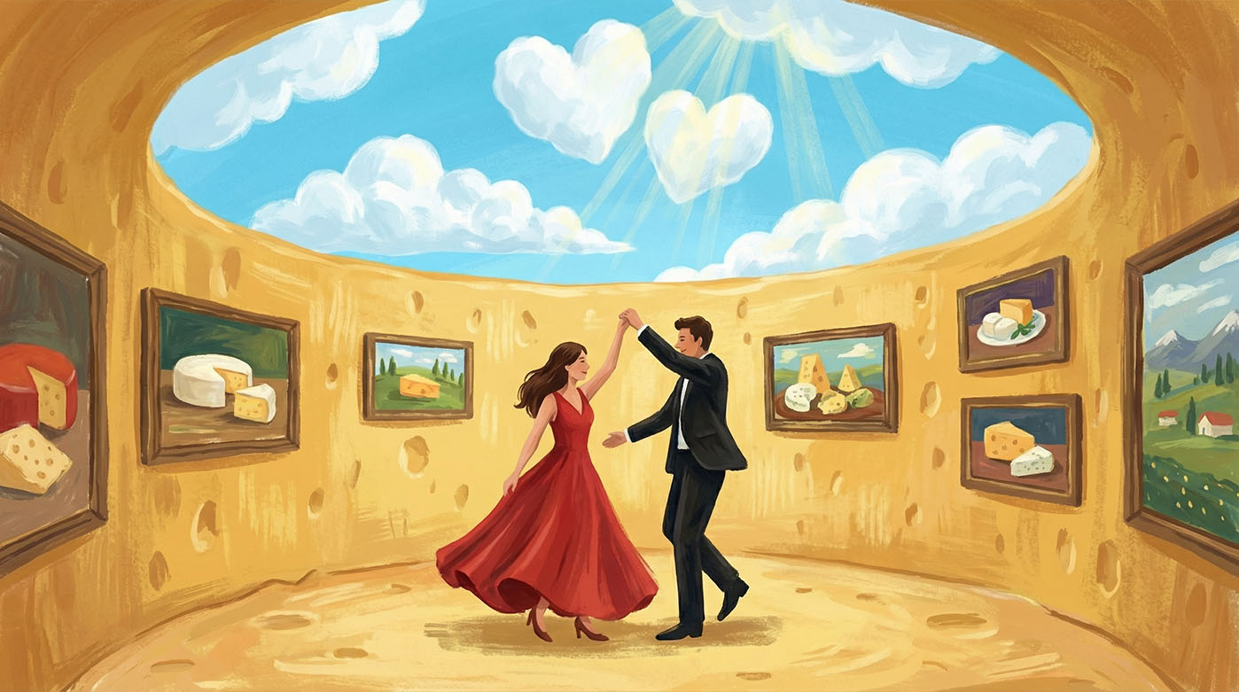 Другий сюжет — це справжній тріумф концептуального дизайну та іронії. Ми створили «сирну галерею», де танець пари відбувається всередині величезної голови сиру, а стіни прикрашені натюрмортами. Це приклад того, як ми в студії любимо працювати з унікальними запитами: ми взяли просту побутову деталь і перетворили її на розкішну бальну залу під відкритим небом. Контраст між класичним вечірнім вбранням героїв та незвичним оточенням створює той самий «wow-ефект», який ми завжди намагаємося втілити у наших клієнтських проєктах.